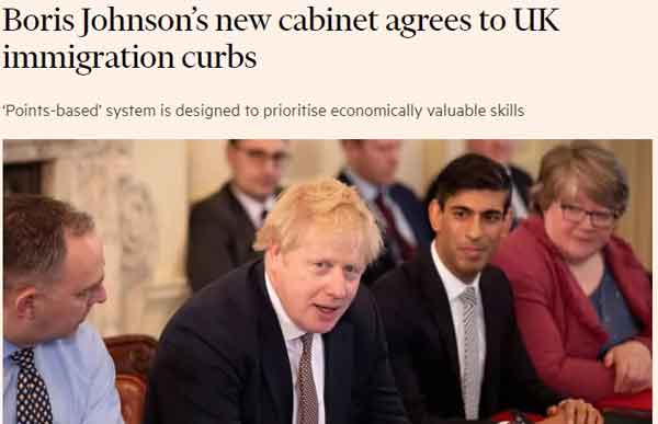 Ministrii din guvernul premierului britanic Boris Johnson au convenit asupra introducerii, de la 1 ianuarie 2021, a unui sistem de imigratie bazat pe puncte, care "va fi mai simplu si mai corect, nu va crea discriminare intre tari si va reda britanicilor controlul democratic al imigratiei", a anuntat vineri Downing Street, transmit Press Association si BBC.