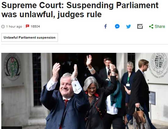 Curtea Suprema a Marii Britanii, cea mai inalta instanta din UK, a decis ca suspendarea Parlamentului de catre premierul Boris Johnson este ilegala. Decizia a fost luata in unanimitate de cei 11 judecatori ai Curtii Supreme, potrivit BBC.